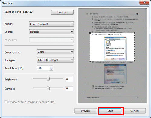 • Wenn Sie [Flachbett] unter [Quelle] wählen, klicken Sie auf [Vorschau], bevor Sie Daten als Datei speichern, und überprüfen Sie das Bild des gescannten Originals.