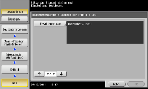 Tippen Sie auf [Bedienerprogramm] - [Adresse/Box] - [Scan-/Fax-Adr. registrieren] - [Adressbuch (Öffentlich)] - [E‑Mail] - [Neu].