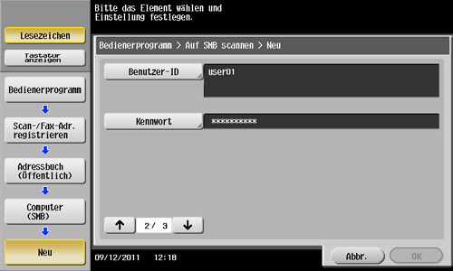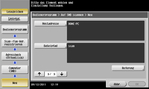 Tippen Sie auf [Bedienerprogramm] - [Adresse/Box] - [Scan-/Fax-Adr. registrieren] - [Adressbuch (Öffentlich)] - [PC (SMB)] - [Neu].