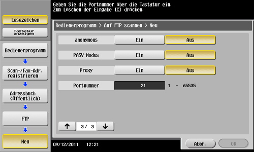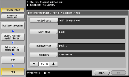 Tippen Sie auf [Bedienerprogramm] - [Adresse/Box] - [Scan-/Fax-Adr. registrieren] - [Adressbuch (Öffentlich)] - [FTP] - [Neu].