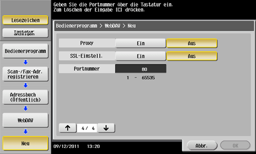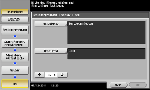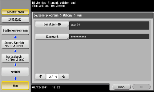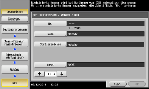 Tippen Sie auf [Bedienerprogramm] - [Adresse/Box] - [Scan-/Fax-Adr. registrieren] - [Adressbuch (Öffentlich)] - [WebDAV] - [Neu].
