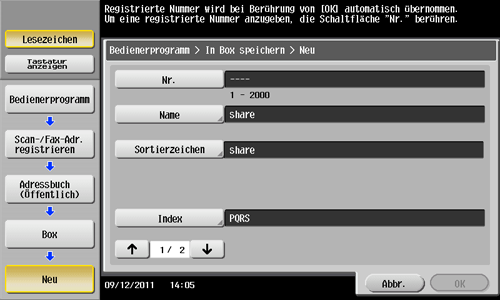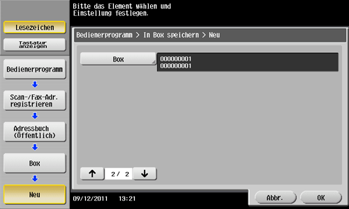 Tippen Sie auf [Bedienerprogramm] - [Adresse/Box] - [Scan-/Fax-Adr. registrieren] - [Adressbuch (Öffentlich)] - [Box] - [Neu].