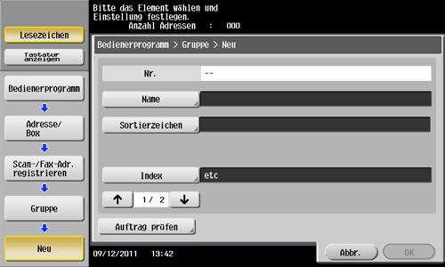 Tippen Sie auf [Bedienerprogramm] - [Adresse/Box] - [Scan-/Fax-Adr. registrieren] - [Gruppe] - [Neu].