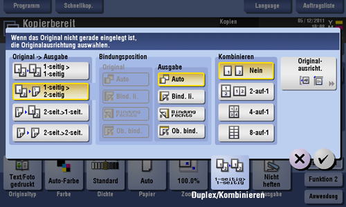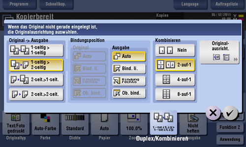 Im Folgenden wird eine Vorgehensweise beschrieben, mit der ein 1-seitiges Original aus mehreren Seiten auf beide Seiten der Blätter kopiert wird.