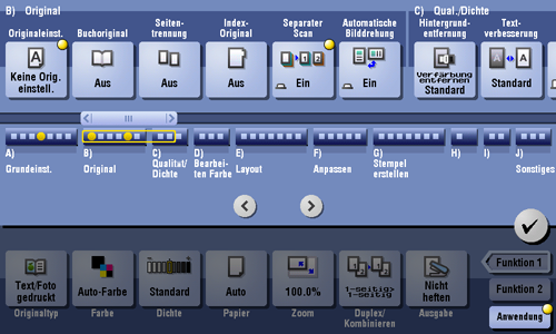 Tippen Sie auf [Anwendung] - [Original] - [Separater Scan] und wählen Sie die Einstellung [EIN].