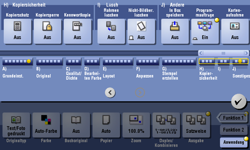 Die einzelnen Originalsätze werden mit jeweils unterschiedlichen Einstellungen gescannt und zusammen kopiert. Verwenden Sie diese Funktion zur Verarbeitung von gemischten Originaltypen, wenn also beispielsweise ein 1-seitiges Original auf eine Seite des Papiers gedruckt und ein 2-seitiges Original vergrößert kopiert werden soll. Nachdem alle Originale gescannt wurden, können Sie Seitenzahlen oder Ausgabefunktionen (z. B. Sortieren) hinzufügen, um sie zu kopieren.