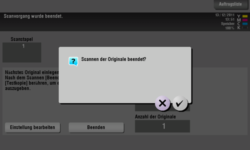 Nachdem alle Originale gescannt wurden, tippen Sie auf [Beenden] und drücken die Taste Start.