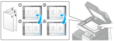 Wenn Sie das Vorlagenglas verwenden, legen Sie die Seiten in der richtigen Reihenfolge auf. Beginnen Sie mit der ersten Seite des Originals, anschließend kopieren Sie die zweite Seite und danach die dritte.