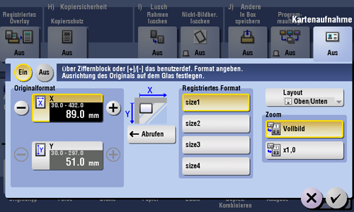 Wählen Sie [Anwendung] - [Sonstige] aus, um [Kartenaufnahme] auf [EIN] zu setzen, und konfigurieren Sie die Einstellungen [Originalformat], [Layout] und [Zoom] für das Ausgabebild.