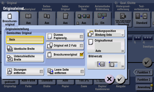 Tippen Sie auf [Anwendung] - [Original] - [Originaleinst.] und wählen Sie [Broschürenoriginal] aus.