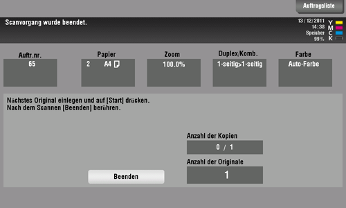 Nachdem alle Originale gescannt wurden, tippen Sie auf [Beenden] und drücken die Taste Start.