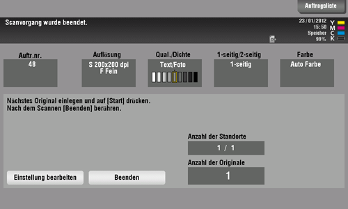 Nachdem alle Originale gescannt wurden, tippen Sie auf [Beenden] und drücken die Taste Start.