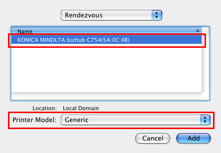 From the [Name] list, select the desired printer for Rendezvous connection.
