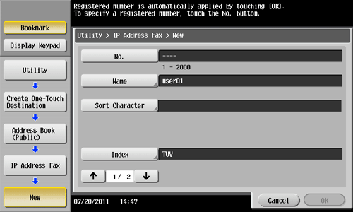 Tap [Utility] - [One-Touch/User Box Registration] - [Create One-Touch Destination] - [Address Book (Public)] - [IP Address Fax] - [New].