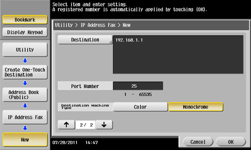 You can also register IP address fax destinations using Web Connection. For details, refer to Here.