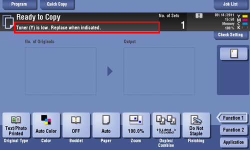 When it is almost time to replace a Toner Cartridge, an advanced warning message appears. Prepare a replacement Toner Cartridge based on the maintenance contract.