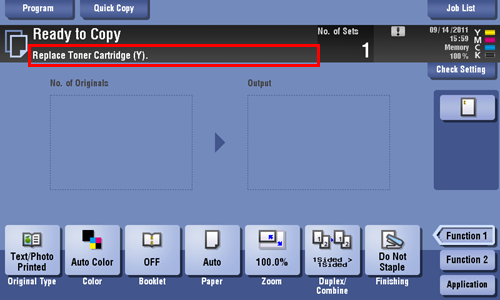 When toner is depleted or when it is time to replace a Imaging Unit, the message shown below appears. When this message appears, replace a Toner Cartridge or Imaging Unit based on the maintenance contract.