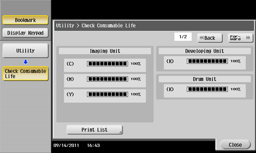 Check the status of consumables (consumption level) using the Touch Panel. When necessary, each level can be printed in list form.