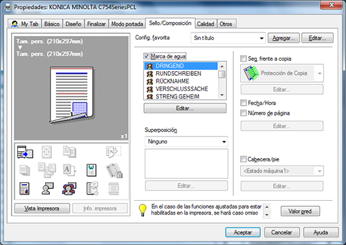 En la ficha [Sello/Composición], seleccione la casilla de verificación [Marca de agua]. Además, seleccione la marca de agua que desea imprimir.
