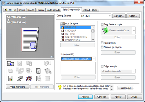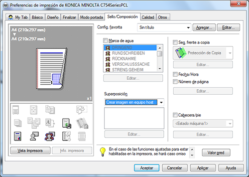 En [Superposición] en la ficha [Sello/Composición], seleccione [Imprim imag en equipo host] o [Imprimir imagen de dispos.] (PCL solamente) y, a continuación, seleccione en la lista la imagen de superposición que se va a imprimir en el original a modo de imagen compuesta.