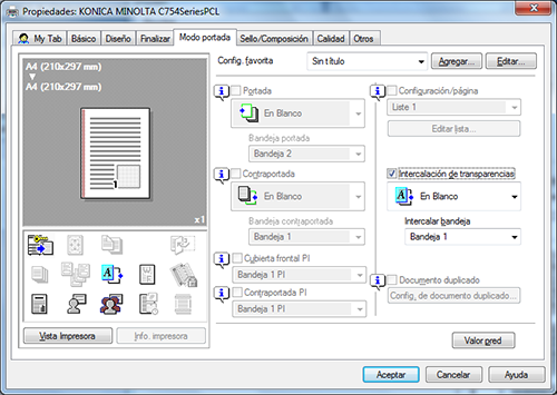 [Portada] | Seleccione esta casilla de verificación para insertar e imprimir en una portada. En [Bandeja portada], seleccione la bandeja de papel para la portada. A continuación, seleccione si debe imprimirse sobre la portada insertada.