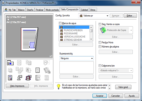 [Repetir sello] | En cada página del documento impreso, se imprime texto como "Copia" o "Privado" a modo de texto invisible. | |
