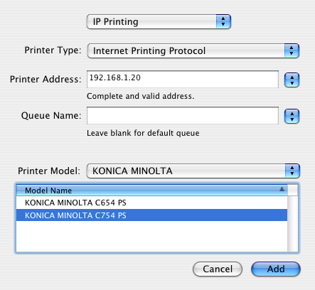 En [Address:], introduzca la dirección IP de la máquina. En [Queue:], introduzca "ipp".