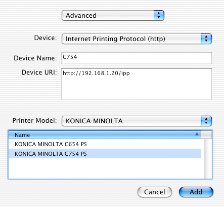 Ajuste el [Device:] a [Internet Printing Protocol (http)].