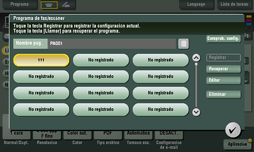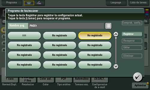 Cuando registra un programa de fax/escáner, puede recuperar la combinación de las opciones de configuración desde la pantalla principal con una sola acción del teclado. También puede incluir un destino en el registro del programa.