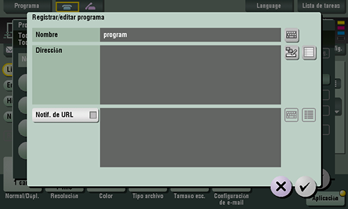 [Notif. de URL] | Puede enviar el mensaje de correo electrónico que contiene la ubicación de guardado de los datos del original a la dirección de correo electrónico especificada. Puede utilizar esta función en la transmisión SMB, transmisión FTP, transmisión WebDAV y los datos guardados en una carpeta. Para notificar la ubicación donde guardar los datos del original, seleccione [Notif. de URL], toque el icono en forma de teclado o el icono de lista, y especifique la dirección de correo electrónico a la que desea enviar el mensaje de correo electrónico. |