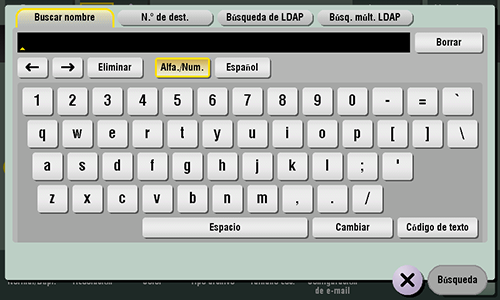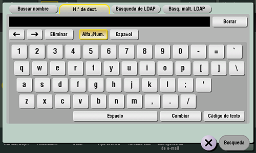 Toque [N.º de dest.] - [Buscar] - [Búsqueda de LDAP] o [Búsq. múlt. LDAP].