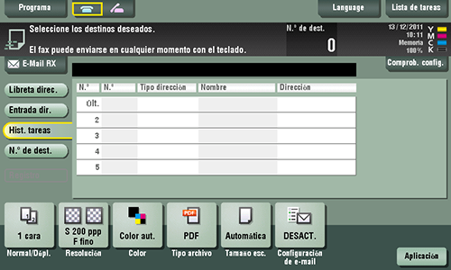 El historial muestra los cinco últimos destinos de fax. Cuando sea necesario, es posible seleccionar varios destinos desde el historial.