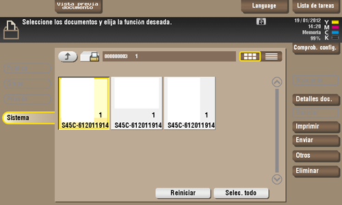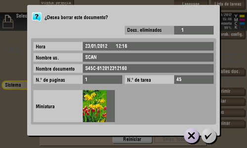 Seleccione un archivo y, a continuación, toque [Eliminar]. El archivo se ha eliminado. Es posible seleccionar varios archivos y borrarlos todos simultáneamente. Compruebe los detalles del archivo y, a continuación, toque [Sí].