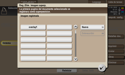 Para registrar un imagen de superposición sobrescribiendo una existente, seleccione la tecla registrada y toque [Sobrescribir].