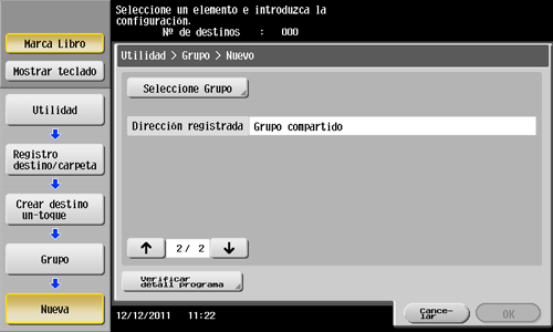 Toque [Utilidades] - [Registro destino/carpeta] - [Crear destino un-toque] - [Grupo] - [Nueva].