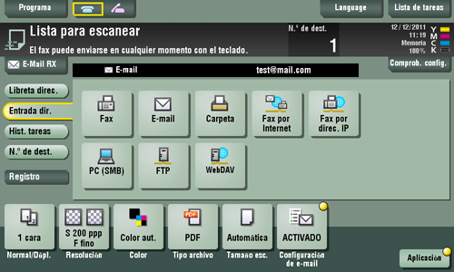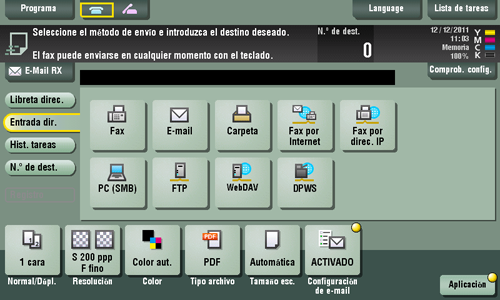 Toque [Entrada dir.], seleccione el tipo de destino y, a continuación, introduzca un destino.