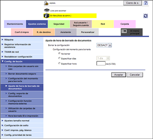 [Borrar la configuración] | Permite al administrador configurar la hora para eliminar automáticamente archivos de carpetas de usuario. Si lo ajusta en [ACTIV.], no puede ajustar una hora de borrado de un archivo para cada carpeta de usuario cuando el usuario crea una carpeta. [DESACT] es la opción predeterminada. |