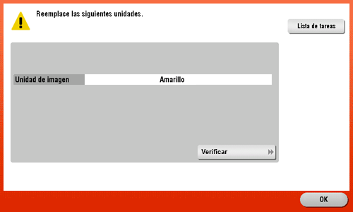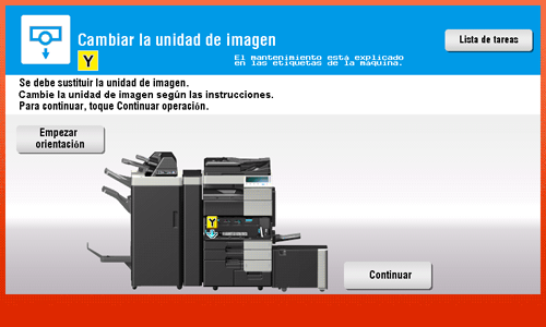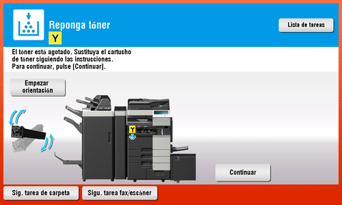 Si llega el momento de reemplazar un cartucho de tóner o unidad de imagen que no sea el negro, es posible forzar que continúe la impresión utilizando el color negro. Toque [Continuar] y después seleccione la tarea de impresión que desee.