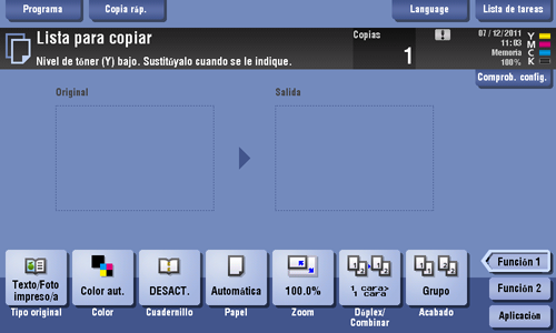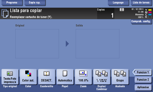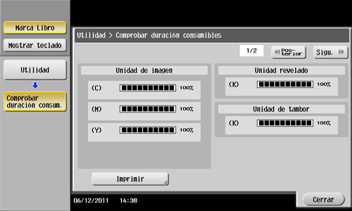 Compruebe el estado de los consumibles (nivel de consumo) utilizando el panel táctil. Si es necesario, es posible imprimir cada nivel en una lista.