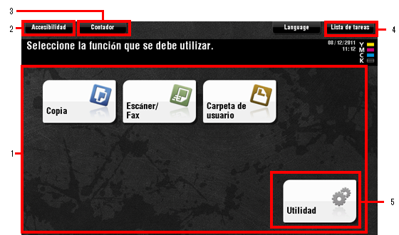 5 | [Utilidad] | Toque este botón para configurar los ajustes de esta máquina o mostrar el estado de uso de esta máquina.