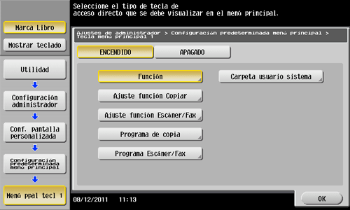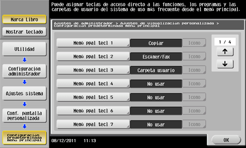 Toque [Utilidad] - [Config de Admin] - [Ajustes sistema] - [Conf. pantalla personalizada] - [Configuración predeterminada menú principal].