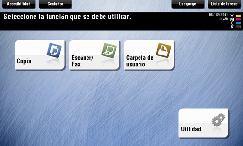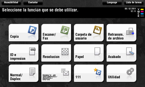 Pulse la tecla Menú en el panel de control para mostrar el menú principal. Puede personalizar las teclas que se mostrarán en el menú principal libremente para adaptarse a sus requisitos.