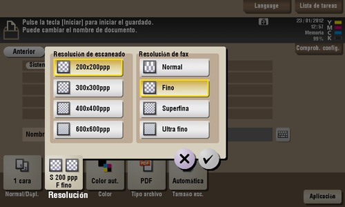 [Resolución de fax] | Seleccione la resolución que desea utilizar para escanear el original para transmisión por fax. Para utilizar las funciones Transmisión de fax, Fax por Internet o Fax por dirección IP, envíe el original en la siguiente resolución.