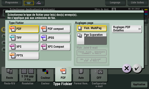 [Réglages PDF Détaillés] | Si [PDF] ou [PDF compact] est sélectionné comme format de fichier, vous pouvez configurer les réglages de l'option PDF. Vous pouvez améliorer la sécurité en joignant une signature numérique identifiant l'auteur du fichier, en cryptant le fichier, etc. Pour des détails, voir ici. |