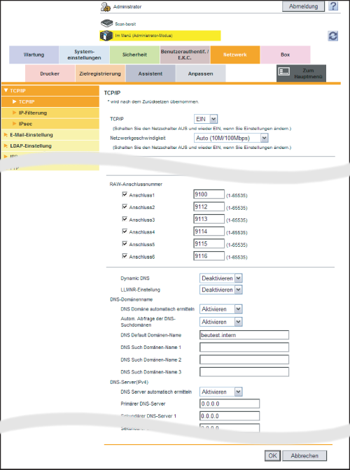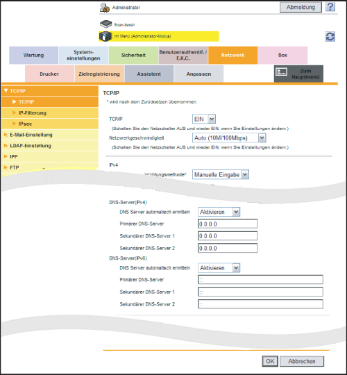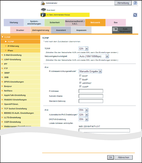 Wählen Sie im Administratormodus [Netzwerk] - [TCP/IP] - [TCP/IP] aus und konfigurieren Sie dann die folgenden Einstellungen.