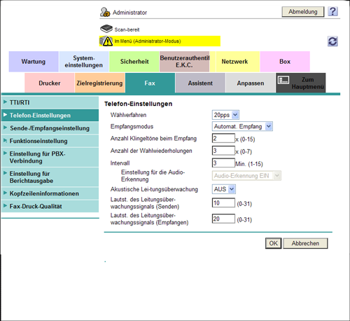 Wählen Sie im Administratormodus [Fax] - [Telefon-Einstellungen] und richten Sie dann die folgenden Einstellungen ein.