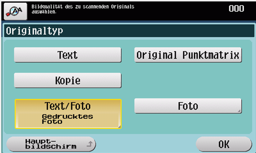 [Kopie] | Tippen Sie auf diese Taste, um ein Original, das eine gleichmäßige Dichte aufweist und mit dem Kopierer oder Drucker ausgegeben wurde, mit optimaler Bildqualität zu scannen. |
