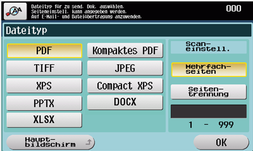 Die verfügbaren Dateitypen sind unter anderem PDF, TIFF, JPEG, XPS, PPTX, DOCX und XLSX. Zum Speichern wichtiger Originaldaten sollten Sie kennwortverschlüsseltes PDF verwenden.