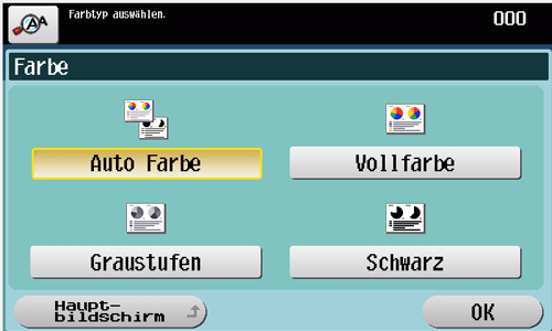 Es gibt vier Farbmodi: [Auto Farbe] zum Scannen auf der Grundlage der Originalfarbe, [Vollfarbe], [Graustufen] und [Schwarz].