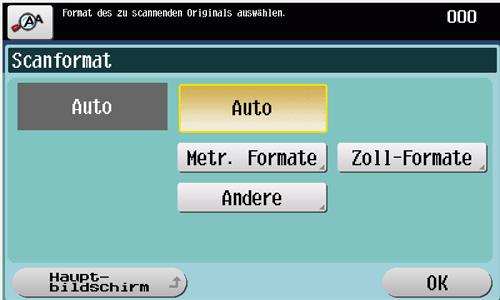 Es gibt verschiedene Scanformate, beispielsweise [Auto], das sich am Originalformat orientiert, [Metr. Formate] und [Zoll-Formate].